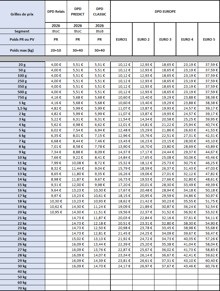 Les prix DPD s’entendent hors participation aux frais d’envoi qui s’élèvent à :